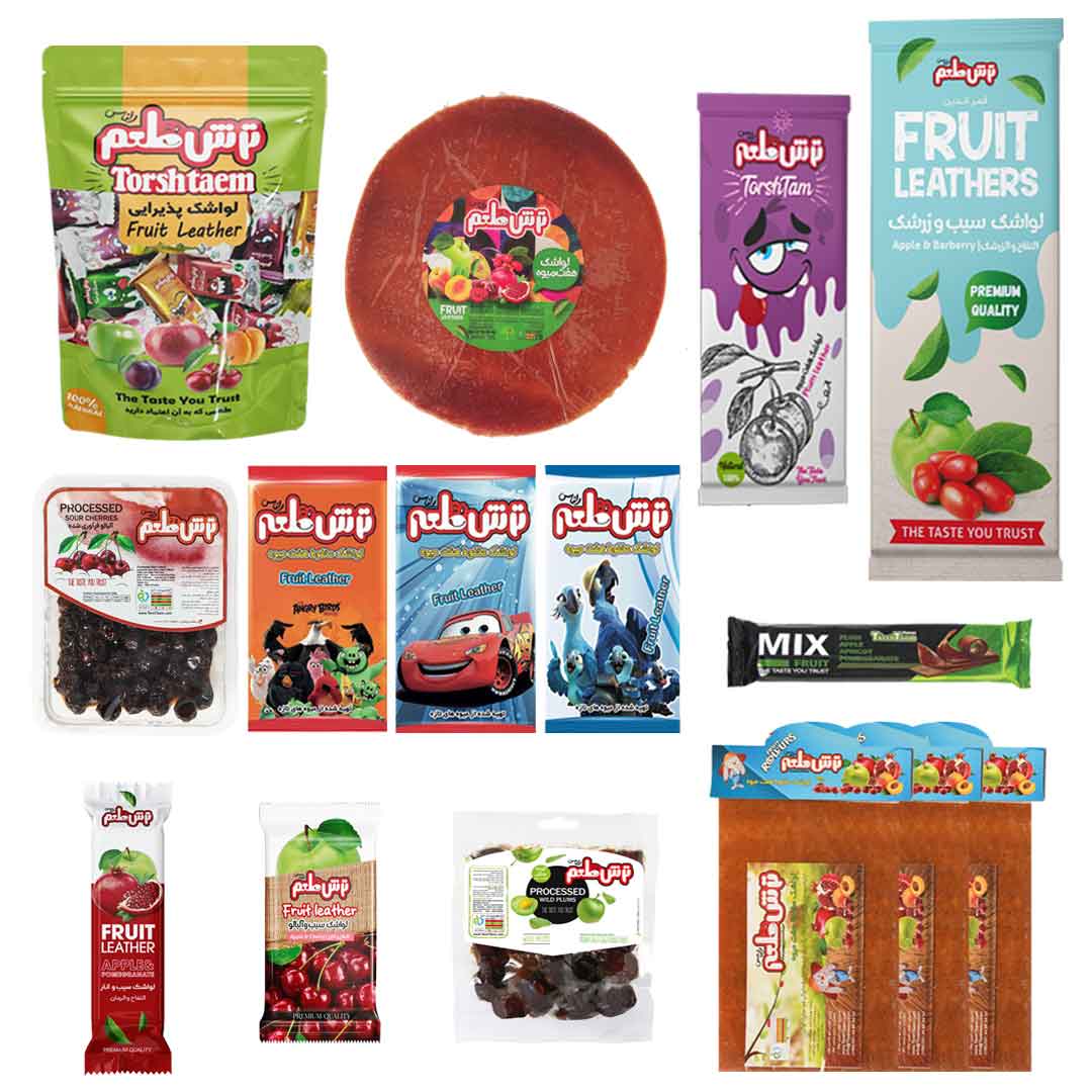 - پرتفوی کامل: ورقهای، رولی، مینی/پذیرایی و ترشک—طعمهای آلو، آلبالو، انار، سیب، زغالاخته، استوایی، میکسبری و…